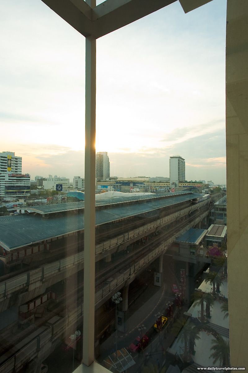 View of downtown Bangkok and the Siam sky train stop seen from the sixth floor of the Paragon Mall.