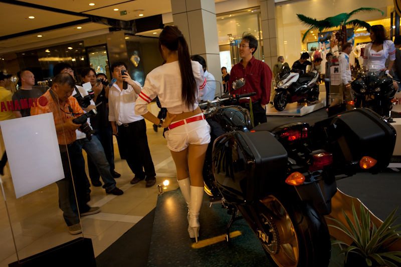 It was difficult to distinguish true motorcycle enthusiasts from those that just came to take quick snapshots of the beautiful models on display. The above was only a mild scrum of amateur photographers. At other times, the line of drooling men measured 4 deep, everyone jockeying for position for access to the Thai beauties.